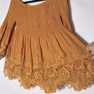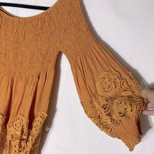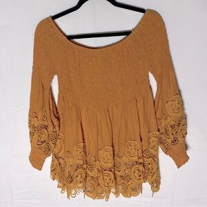 Petal Roz Yellow Smocked Off Shoulder Puff Sleeve Lace Trimmed Blouse L