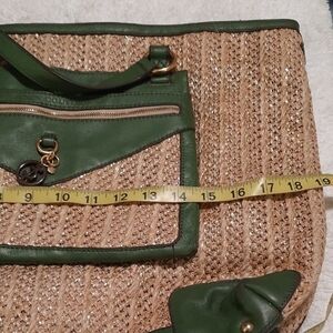 Juicy Couture tote with green accents and tan woven design. Ideal for daily essentials.