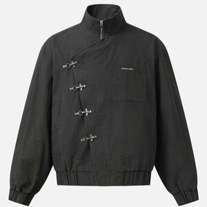Stylish jacket with unique asymmetrical design. Features a high collar and secure fastenings. Ideal for modern fashion.