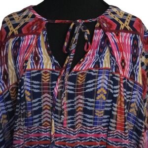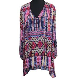 Uncle Frank boho tunic dress showcases a vibrant mixed geometric and ikat print in a multi-color palette of pink, blue, and mustard. Designed with a relaxed, flowy silhouette, this piece features a split V-neckline with delicate tassel ties and long sleeves with elasticized cuffs. The lightweight fabric and tiered construction create a comfortable, breezy fit perfect for casual outings or festival wear.