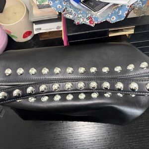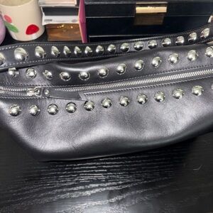 Chic black leather bag by Stuart Weitzman. Features stylish stud accents.
