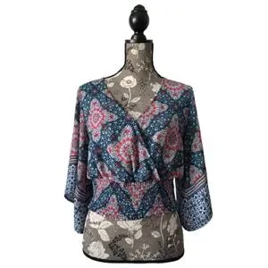 Other details: beautiful pull over top, v faux wrap around neck line, 3/4 sleeves, bottom stretchy (stretches 2-3 inches) and gathered with elastic, relaxed fit. Original labels with size, care instructions and material was removed for comfort.