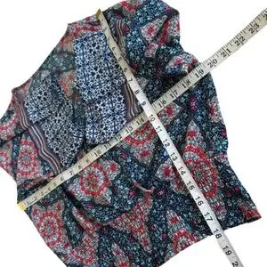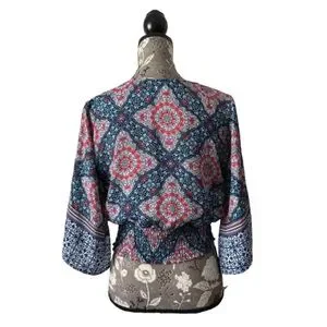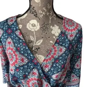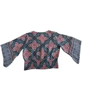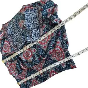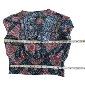 Blue & Red Women' S-M Floral Geometric Bohemian Design Sleeved V Neck Crop Top