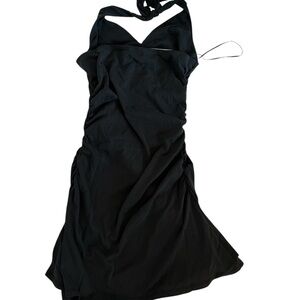Name/Item Details: The Ariana halter mini dress, short and chic, form-fitting mini, ruched side detail, adjustable halter tie, tie neck.