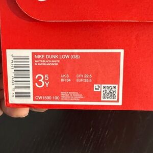 The Nike Dunk Low Big Kids' Shoes in size 3.5y (GS) are a stylish and comfortable choice for young sneaker enthusiasts. With a low top design and lace-up closure, these athletic shoes are perfect for casual occasions. The black color with logo accents adds a trendy touch, while the moderate cushioning level and flat heel ensure all-day wearability. Made with leather upper material and a foam insole, these Nike Dunks combine durability with a touch of luxury. Whether it's for summer, fall, or spring, these sneakers are a versatile and fashionable choice for unisex kids.