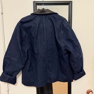 Chic navy jean jacket with a bold black collar. Features front pockets and button closure. Ideal for casual wear.