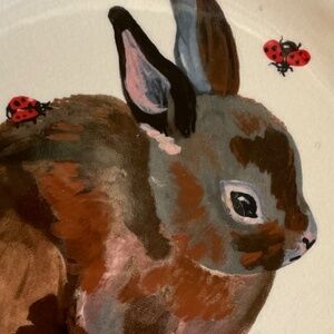 Charming ceramic plates with animal motifs - one with a colorful parrot, the other with an adorable rabbit. Each features vibrant colors and beautiful design motifs. Plates are 10" wide and sturdy. Perfect for adding charm and color to your dining table! Sold as a set of 2