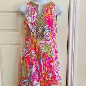 Chic dress with a pink and white pattern. Elegant design by Lilly Pulitzer. Fully lined.