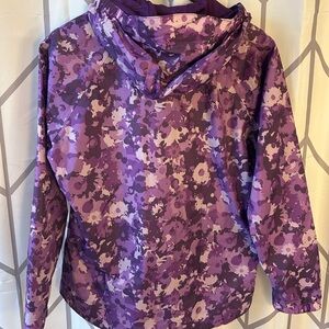 Stylish purple floral jacket. Features a full zip and hood. Perfect for outdoor adventures.