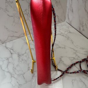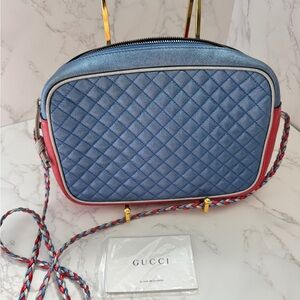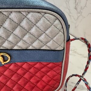 Stylish Gucci crossbody or shoulder bag in signature quilted diamond pattern. Red, marine blue and silver metallic leather with gold and silver tone interlocking G Horsebit hardware. The crossbody strap is a braided tricolor leather. Red floral interior and original papers. This is in great condition and comes with the certificate of authenticity.