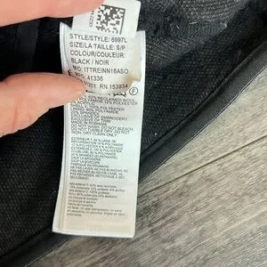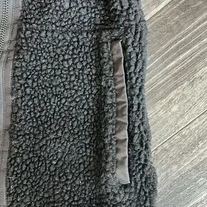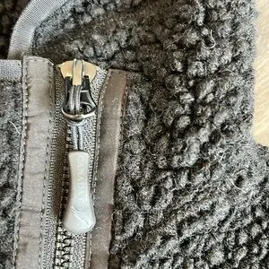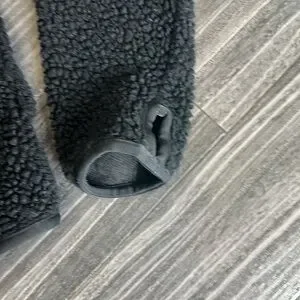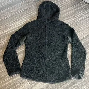 Size small. Black fleece. Authentic with classic logo on outer arm and holographic tag inside. High low design for better bottom coverage. Angled zipper for a unique style! Front side pockets. Slim fit. Shoulder to back bottom hem is 24.5”. Shoulder to front hem is 21.5”. Armpit to armpit is 17.5” vented under arms and thumb-holes at cuffs. Minor damage to zipper pull-zipper works perfectly. Preloved with pilling throughout. 🌸