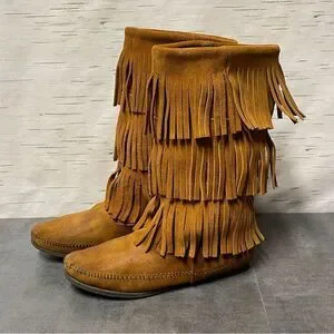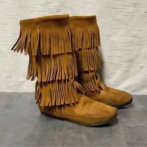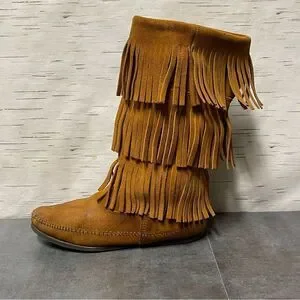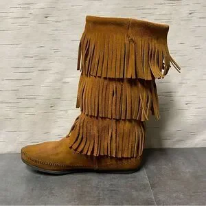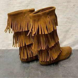 Minnetonka Women’s 3-Layer Fringe Brown Suede Leather Boots Size 8