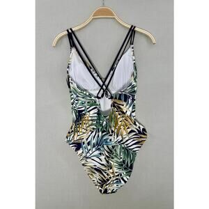 Bold tropical palm leaf one-piece swimsuit with strappy neckline and cross-back detail. Athletic yet flattering cut. Perfect for beach trips, pool parties, or vacation.
