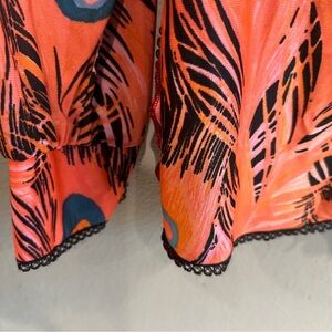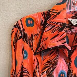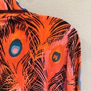 Make a bold vintage statement with this stunning late-70s/early-80s Mr. Stan button-down blouse. Features a vibrant peacock feather print in coral, teal, black, and pink on a lightweight woven rayon-blend fabric that drapes beautifully.