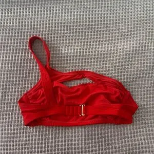 Bold red bikini top with a unique one-shoulder design. Perfect for a chic beach look.