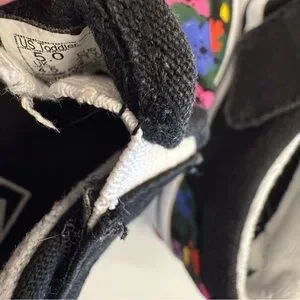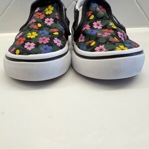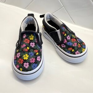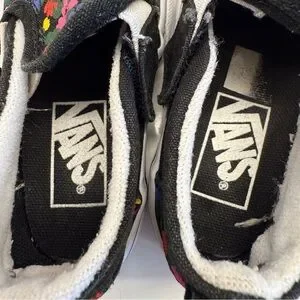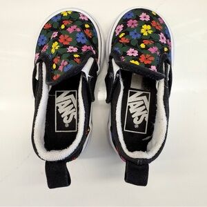 Keywords: Vans Kids, floral slip-on, multicolor, casual shoes, cushioned insole, elastic accents, canvas upper, rubber outsole, unisex kids, spring shoes, colorful pattern, playdate shoes, school shoes, pre-owned.