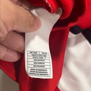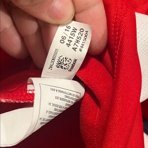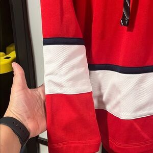 Red Reebok pullover featuring Capitals logo. Gray hood and white accents add contrast.
