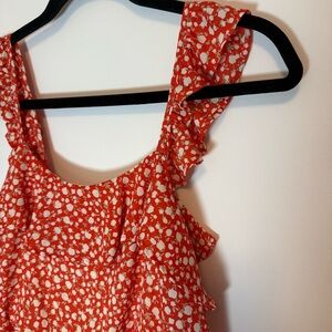 Vibrant red dress with white floral design. Sleeveless and stylish. Ideal for summer days. Super cute when it’s on.
