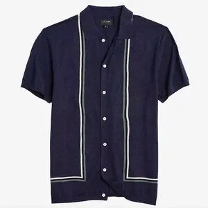This men’s short-sleeve knit button-up shirt features a structured open collar with a clean, tailored silhouette that blends vintage inspiration with modern polish. Designed in a deep navy blue knit fabric, the top is accented with vertical contrast stripe detailing in soft ivory and muted green tones running down the front for a refined, retro-inspired look. Finished with full front button closure, ribbed collar and hem, and smooth short sleeves, this lightweight knit offers breathable comfort with a slightly elevated feel. Perfect for summer occasions, date nights, vacations, or smart-casual styling, this versatile top pairs effortlessly with trousers, chinos, or tailored shorts for a polished yet relaxed outfit.
