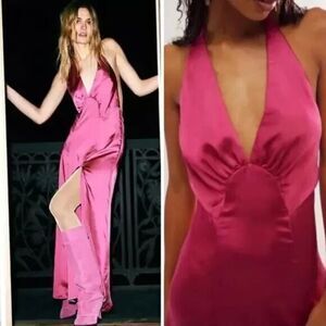 Features: Soft satin fabrication, plunging V-neckline, flattering seaming throughout, exaggerated leg slit, halter-style with an open back, ruched back detail, lined