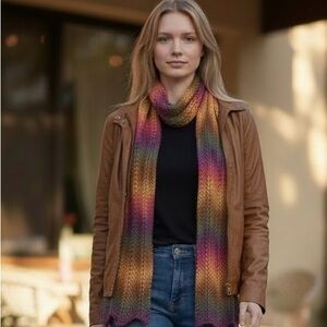 With subtle but eyecatching colors of burgandy, greens, golds and browns, this scarf can be paired with many different outfits.