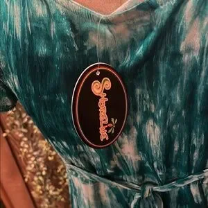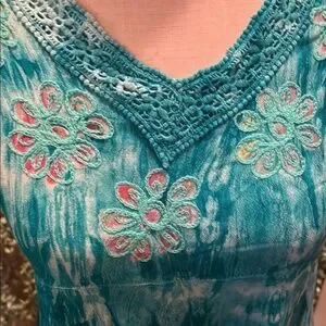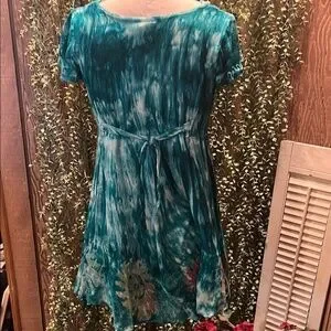 NWT Pretty teal tie dye/floral dress/coverup. V-neck, cap, sleeves, tie back,hi/low hemline. Smoke free home.