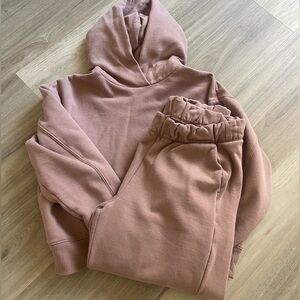 Chic dusty rose jogger set for women. Soft fabric. Ideal for casual outings. Tapered leg silhouette with an ankle-length cut.