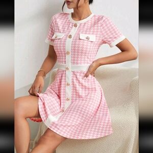 Elevate your style with this chic pink houndstooth dress. Featuring a classic button-front design, it's perfect for any occasion. The soft pink hue adds a touch of elegance to your wardrobe. New in boutique. NEW