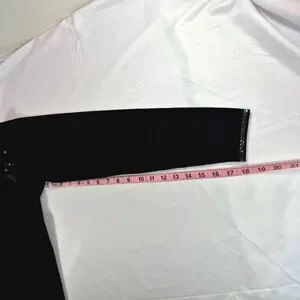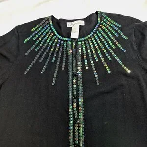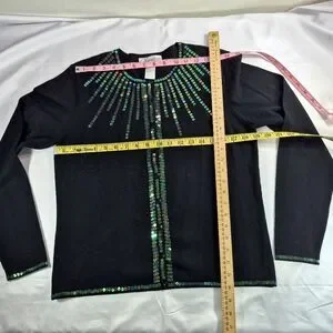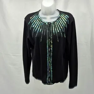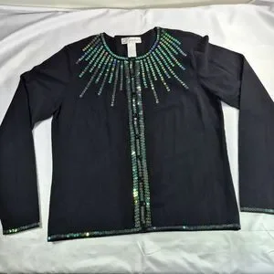 This elegant and eye-catching black cardigan from Dress Barn is perfect for holiday parties or adding a touch of sparkle to any outfit. The sweater features a stunning display of metallic, iridescent sequins in shades of teal, green, and purple, arranged in a dazzling sunburst pattern across the chest and continuing down the front placket and bottom hem. It is a lightweight knit with button-front closure and a classic crew neckline. Made from a comfortable and breathable blend, typically ramie and cotton, this versatile piece can be dressed up with a skirt or trousers for an event or worn casually over a simple top and jeans.