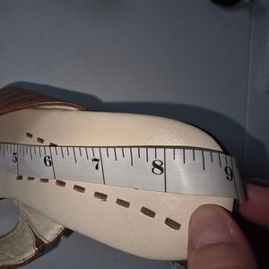 BCBGMAXAZRIA brown croc-embossed leather mule sandals feature a sophisticated slide-on design with a high wood-look stiletto heel. Crafted in Brazil, these heels showcase a unique rectangular buckle detail on the upper strap and a textured crocodile pattern throughout the leather. The neutral tan and cream color palette makes them a versatile choice for dressy occasions or elevated casual wear. These shoes show some signs of wear including scuffing on the heel tips and light marks on the insoles.
