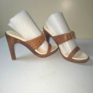 BCBGMAXAZRIA Brown Croc Embossed Leather Mule Heels Wood Stiletto Y2K Rare