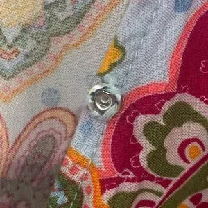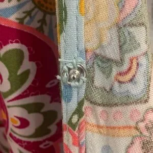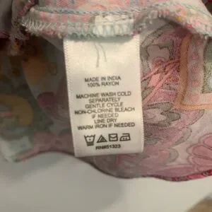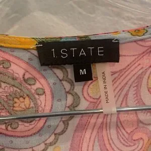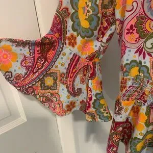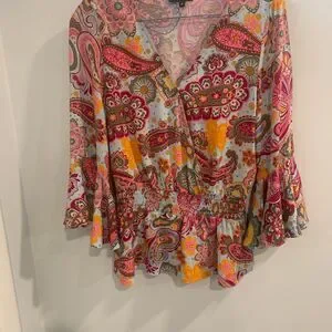This top from 1. State features a vibrant pink and orange palette with a relaxed fit and graphic design. The notched collar and ruffled bell sleeves add a touch of elegance, while the peplum style enhances its chic appeal.