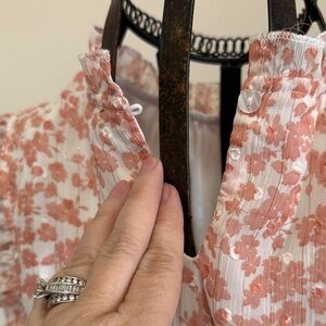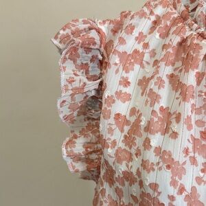 Elevate your style with this chic floral blouse. The soft pink color and ruffle sleeves add a feminine touch, perfect for any occasion.