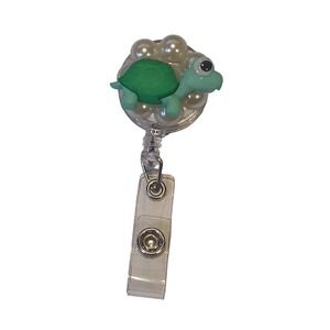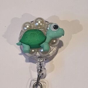 Handmade retractable badge reel features a charming green sea turtle embellishment set against a cluster of shimmering faux pearls. This whimsical accessory includes a durable clear plastic strap with a secure snap closure for holding ID cards or keys, and a sturdy metal alligator clip on the reverse for easy attachment to scrubs, belts, or pockets. Perfect for nurses, teachers, healthcare or office professionals looking to add a touch of personality to their daily uniform.