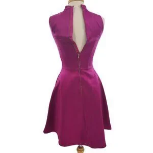 Sleek and structured with a playful silhouette, this satin mini dress captures timeless sophistication with a modern twist. The high neckline and sleeveless bodice create clean lines, while the flared skirt adds soft movement that catches the light with every step. Its rich jewel-toned hue fits effortlessly into glam, preppy, and downtown aesthetics. Side pockets keep it practical, and the exposed gold zipper at back adds just the right amount of edge. Whether paired with heels for parties or worn solo for a night out, this dress is made to stand out in any setting.