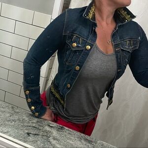Junior women denim jean jacket. Have sequins collar and waist ban of jacket. Two ways of wearing the cuffs.