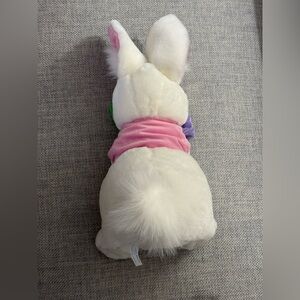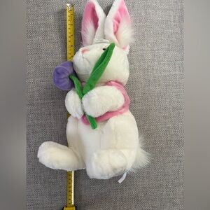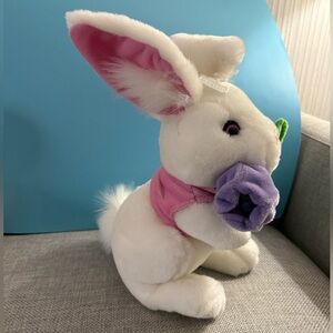 NWOT. Adorable white plush bunny holding a purple flower. Soft bunny has not been played with or used (a little plastic hanger still stuck into the forehead from store). Measures approx 16 inches in length from tip of ear to foot. In a sitting position.