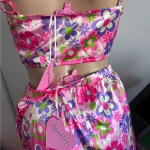 Vibrant pink sheer set with floral patterns. Features button-up top and matching bottoms. Playful and stylish. 3 piece set, bottom parts are shorts.you can wear it together or separate. Size Small. NWT.