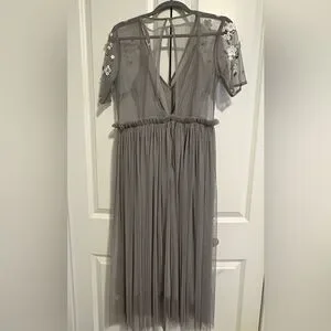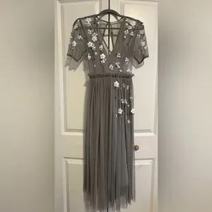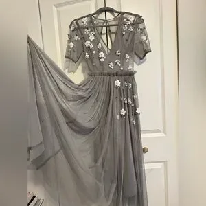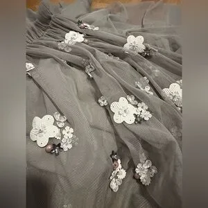 Tulle gray dress with white floral accents. Sheer overlay and elegant flow. Perfect for special occasions.