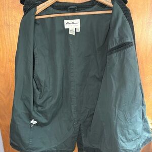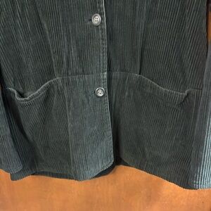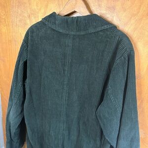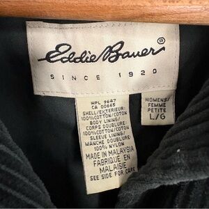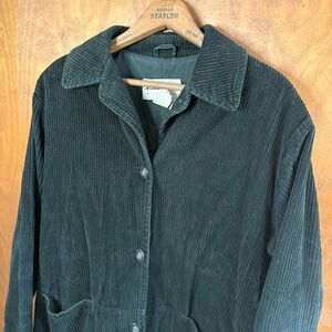 Gorgeous vintage Eddie Bauer dark green almost black corduroy chore coat barn jacket in a women's size large. It features a button up front closure, a relaxed slouchy oversized fit, 2 front pockets, a full lining, & a collar. 100% cotton fabric. As seen in the photos there's some fading & fuzziness.