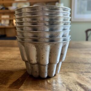 Vintage set of 8 fluted tin baking molds, ideal for mini babka, brioche, individual cakes, jellies, or pastry desserts. Classic scalloped design creates beautiful bakery-style presentation.
