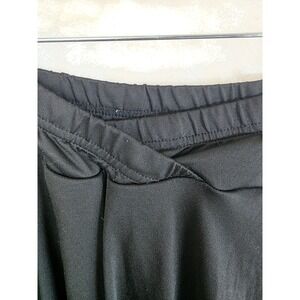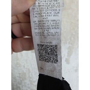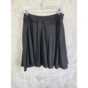 Shein Curve black skater skirt crafted from a comfortable stretch jersey fabric. This versatile piece features a flattering high-waisted elastic waistband with a unique crossover v-front detail and a flowy, flared silhouette. Perfect for casual wear or dressing up, this mini to midi length skirt offers a classic solid black look that pairs easily with any top. Note that there are minor fabric snags as shown in the close-up photos.