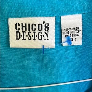 linen, some stains shown in pictures, some threading. size 3 from Chicos their sizing works differently. 100% linen and gorgeous color