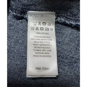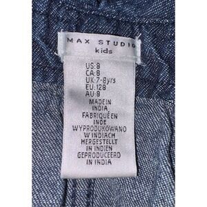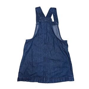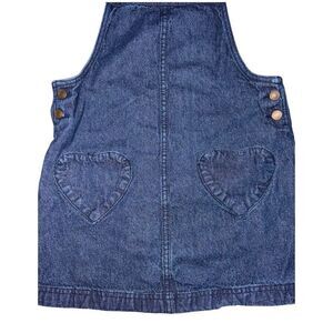 Dark wash denim jumper. Heart shaped pockets. Side button closure. 100% cotton. Size: 8. Preowned in good condition.