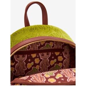 Charming backpack with Groot design. Features green and pink hues with floral accents.