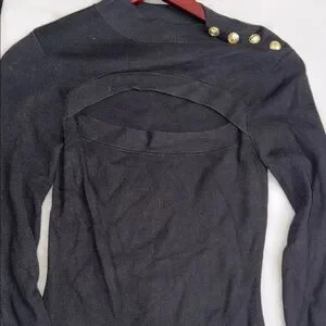 Elegant black top with unique cutout design. Features gold button details on shoulder. Ideal for a sophisticated style.