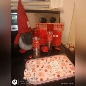 Indulge in the refreshing scent of Peppermint Swirl Body Mist. This set includes a vibrant red mist perfect for a rejuvenating experience. Ideal for gifting or personal use.Bath & Body Works peppermint bark truffle fine fragrance mist * 2, Emily and Paris towel, spa headset and wristband set high quality water absorbent slip resistant and gnome