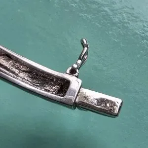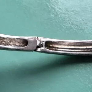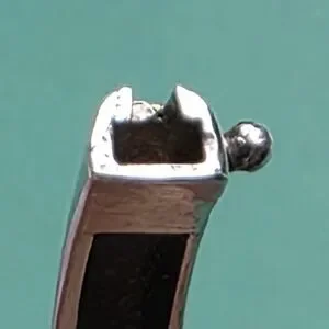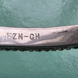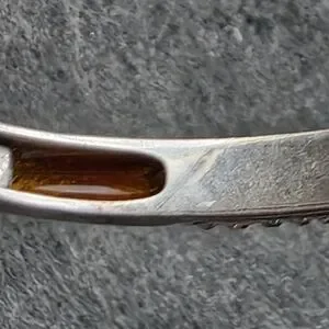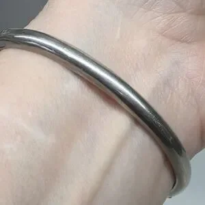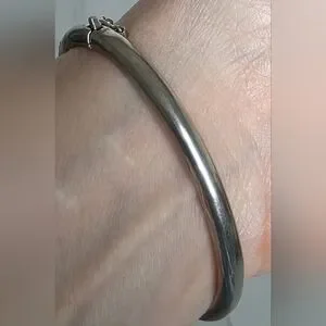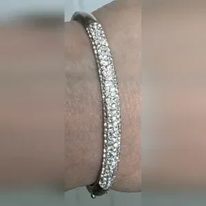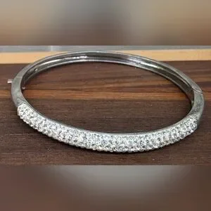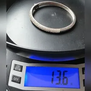 Acid test positive (See last photo) for 925 sterling silver. Rhinestones across the top. 7 5/8 inches interior circumference. 2 3/4 inch diameter. Hallmarked, hinged bracelet cuff with a 1.25 inch gap when opened. Vintage. I cleaned some of the tarnish with a silver polishing cloth, but it is still present within the interior grooved openings. 13.6 grams.