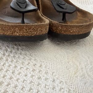 Stylish Birkenstock sandals with sleek black straps. Soft brown footbed for comfort. Perfect for everyday wear.