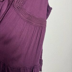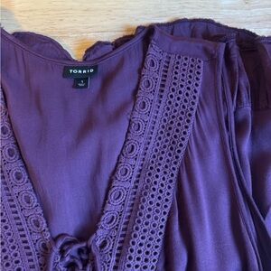 Torrid Bohemian Tassel Eyelet Sleeveless Ruffle Blouse. Purple, eggplant, wine, burgundy, fall, autumn, winter layering piece. Tank top. Draped asymmetrical hem. Women’s torrid size 1 is equal to extra large or 14 16 plus size. Please see photos for minor piling.